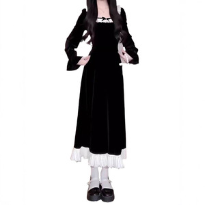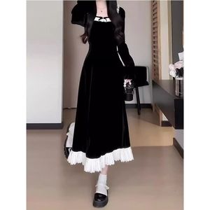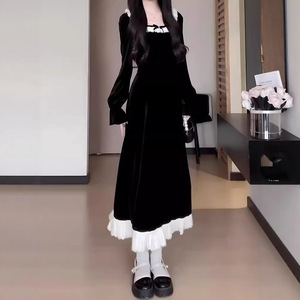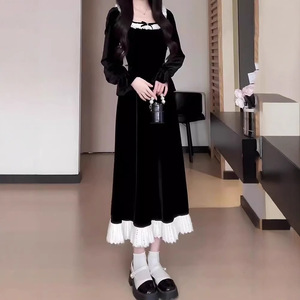 早秋法式感方领气质丝绒连衣裙女秋冬收腰遮胯显瘦小黑裙