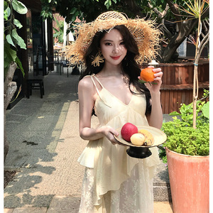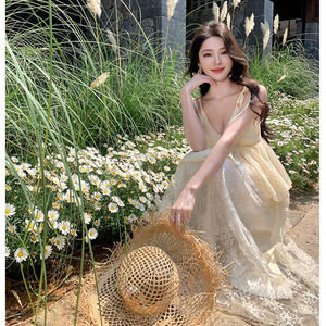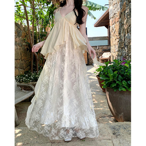 2025新款仙德瑞拉浪漫重工刺绣吊带长裙领蕾丝拼接旅游度假长裙