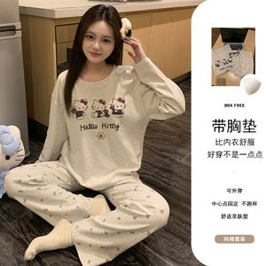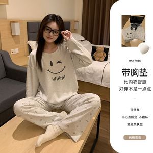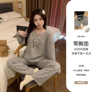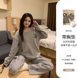秋季新款睡衣女纯棉带胸垫长袖长裤套装卡通可爱可外穿两件套装