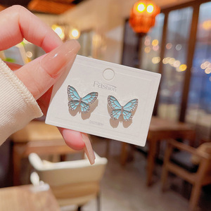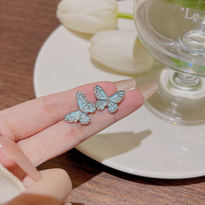 S925银针韩版蓝色滴油蝴蝶耳钉女轻奢小众设计耳环小清新甜美耳钉