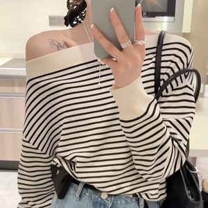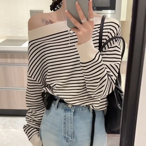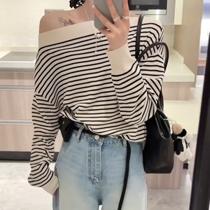 韩系黑白条纹斜肩长袖上衣女2025春季新款宽松露肩卫衣设计感小众