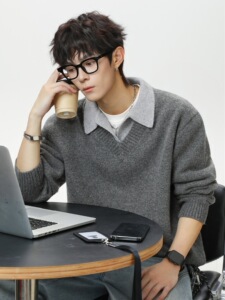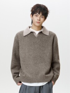 老钱风质感假两件V领毛衣男秋冬新款复古翻领polo针织衫保暖外套