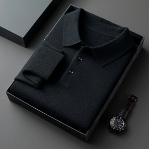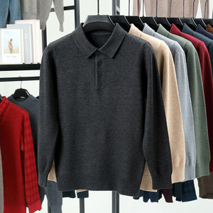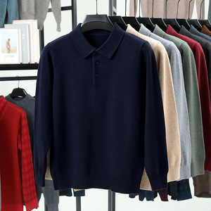 新款跨境秋冬季羊毛翻领长袖男士针织POLO衫纯色中年打底毛衣男装
