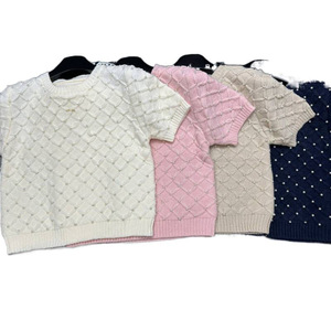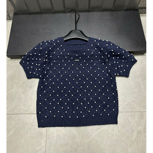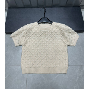 2025年秋季新款香家logo珍珠菱格针织短袖圆领套头宽松百搭女毛衣