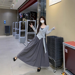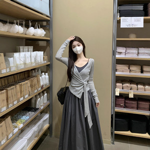 大码韩系氛围感设计绑带长袖T恤上衣+吊带连衣裙两件套女秋季
