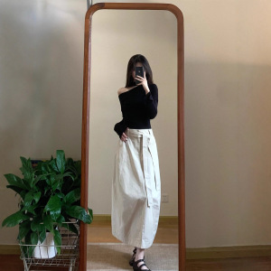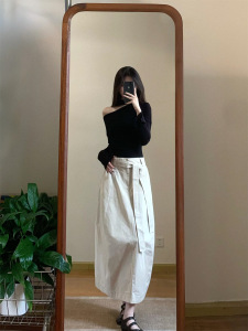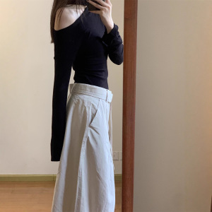 实拍 2025秋季甜辣设计感斜肩不规则修身长袖上衣+高腰花苞半身裙