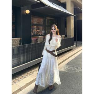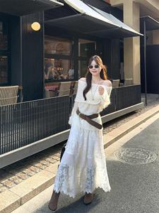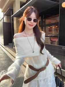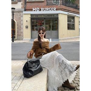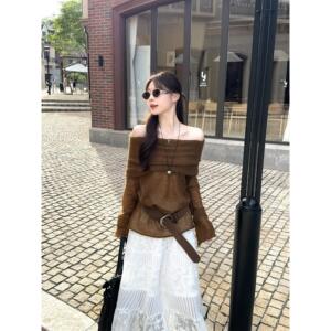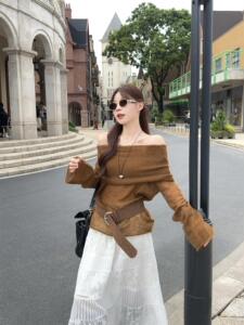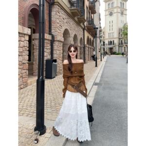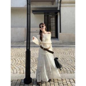 秋冬季新款时尚法式甜美软糯一字肩毛衣A字蕾丝提花半身裙套装女