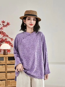 2025秋季新款亚麻提花上衣立领新中式斜襟盘扣长袖宽松套头衬衣
