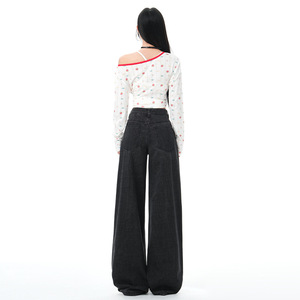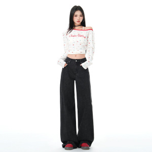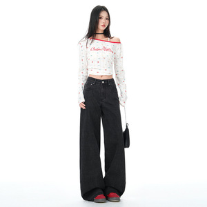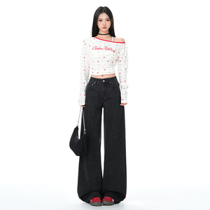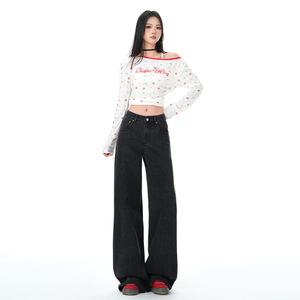 复古美式条纹阔腿牛仔裤女秋季新款宽松慵懒高腰直筒拖地裤潮