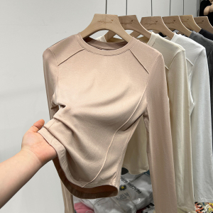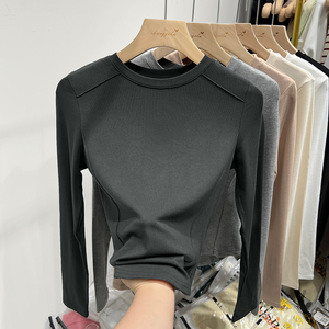 早秋长袖不规则t恤女奶白灰弧形下摆外穿打底衫纯欲修身圆领内搭
