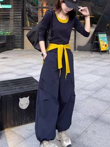 新款穿搭一整套撞色设计感修身长袖T恤高腰口袋阔腿裤披肩三件套