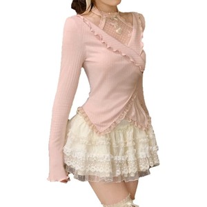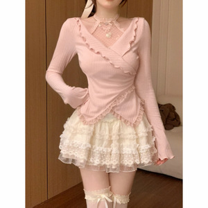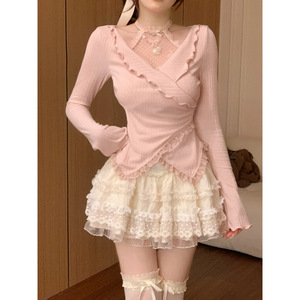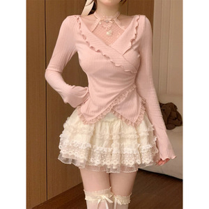 纯欲甜美套装秋季修身显瘦设计感不规则上衣+蕾丝半身裙两件套女