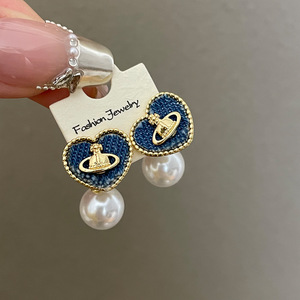 韩系设计感土星牛仔珍珠吊坠925银针耳钉女小众高级个性耳环耳饰