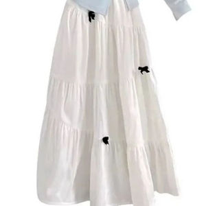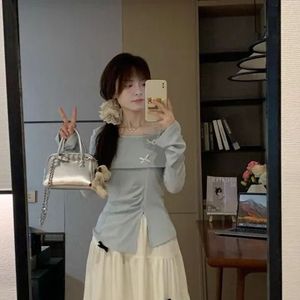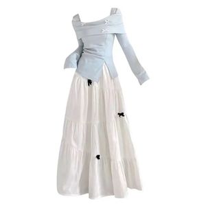 法式温柔风蝴蝶结设计感秋季蓝色开叉长袖上衣高腰修身半身裙套装