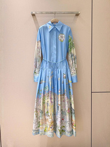 2025新款法式浪漫经典翻领+长袖棉质地蓝色印花衬衫式连衣裙