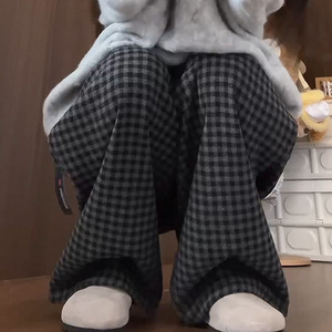 日系慵懒风棋盘格复古休闲裤女毛呢加绒秋冬季高腰阔腿裤外贸批发
