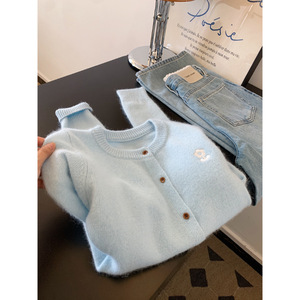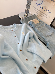 韩系外搭浅蓝色软糯针织开衫女上衣2025新款秋季穿搭毛衣女外套