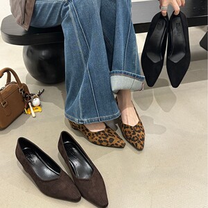 2025秋季新款绒面尖头粗跟中跟单鞋软底浅口百搭高跟瓢鞋通勤女鞋