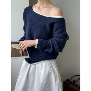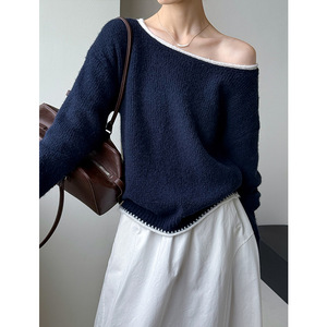 橘芷早秋新款韩系露肩一字肩针织显瘦精致撞色收腰韩版上衣6608