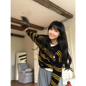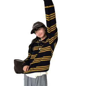 韩国hone新款超火毛衣套头针织衫polo领撞色条纹洋气宽松显瘦女装