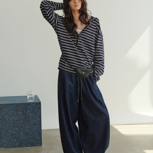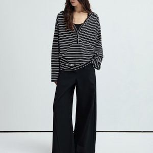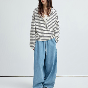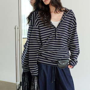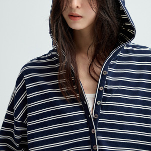 轻运动连帽排扣下摆自然微堆 宽松落肩长袖条纹上衣