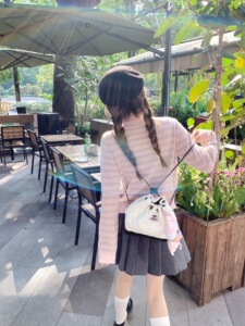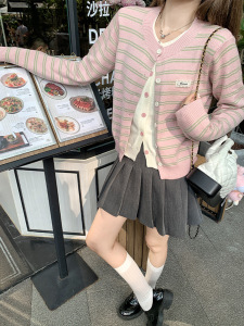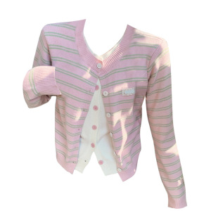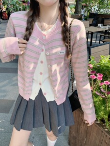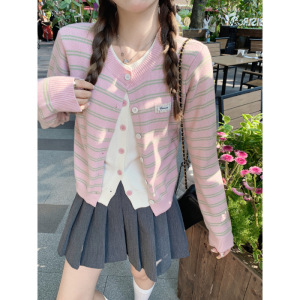 韩系条纹针织开衫女2025秋季新款宽松显瘦百搭假两件长袖上衣