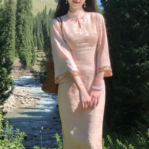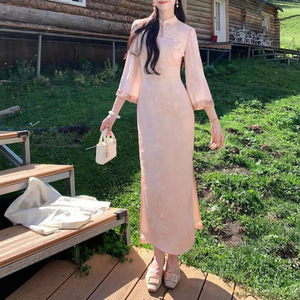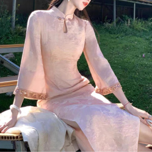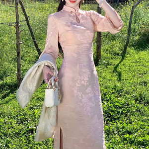 2025年【甜月香】新中式珠光提花改良旗袍早秋旗袍领镂空连衣裙