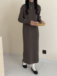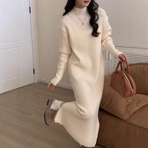 韩系简约半高领针织连衣裙女士秋冬新款加厚宽松慵懒打底毛衣长裙