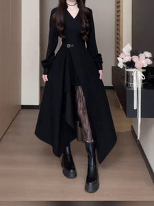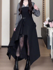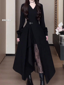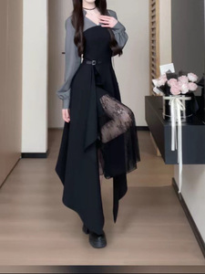2025年秋新款拼接衬衫裙蕾丝不对称气质显瘦百搭设计感长袖连衣裙