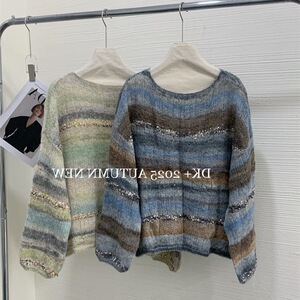 2025秋冬季新款时尚百搭显瘦圆领拼色针织衫女宽松休闲毛衣上衣潮