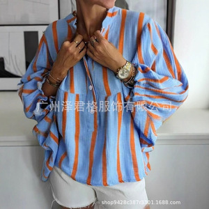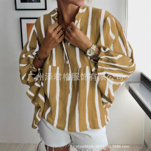 2025款亚马逊热销独立站新款女士V领印花条纹泡泡袖时尚休闲