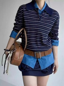 美利奴羊毛 Miu系知识分子老钱复古Polo条纹针织衫毛衣女