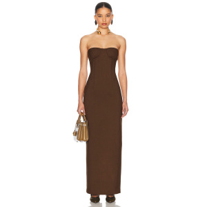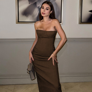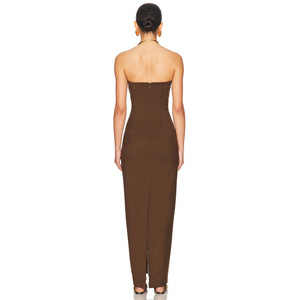 欧美跨境礼服裙无袖抹胸露背开叉长款咖色女士弹力连衣裙绷带裙