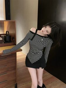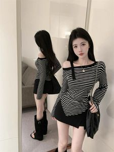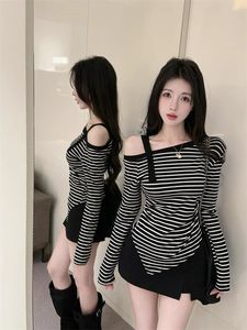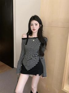 2025秋季新款斜领露肩时尚洋气长袖T恤女装小众撞色条纹休闲上衣