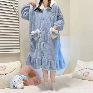 珊瑚绒睡袍女冬季加厚加绒睡裙卡通长款睡衣外穿刺绣甜美家居服女