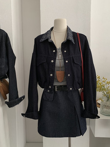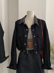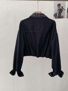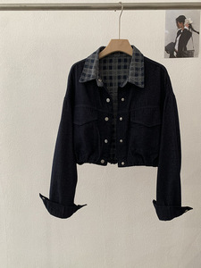 欧玛莱 翻领格子拼接牛仔短外套女韩版休闲百搭夹克上衣实拍 4770