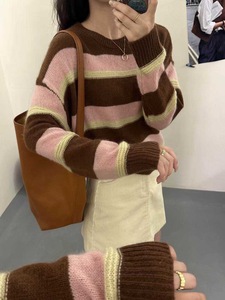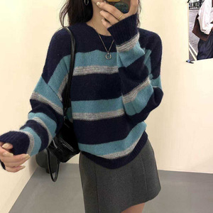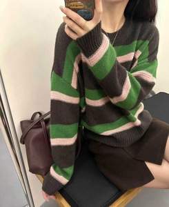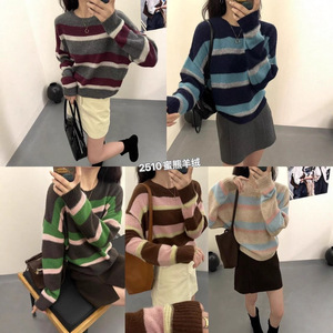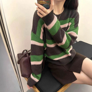 蜜熊羊绒毛衣 2025秋季新款 韩版慵懒风条纹撞色上衣针织衫女2510