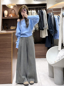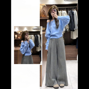 一整套ootd穿搭2025法式温柔慵懒风斜肩针织毛衣休闲阔腿裤两件套