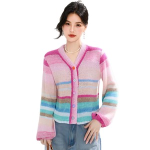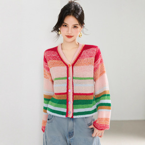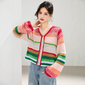 韩系甜美彩色条纹针织开衫女秋季新款洋气减龄超好看漂亮外套上衣