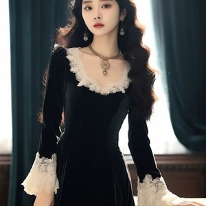 新款法式复古蕾丝连衣裙长裙花边拼接秋冬气质显瘦丝绒黑色裙子