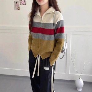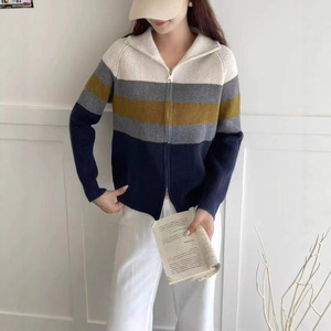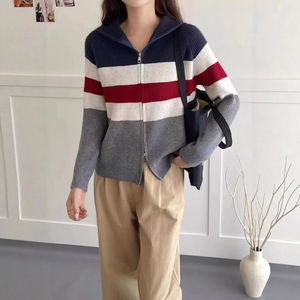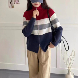 韩系撞色拉链针织外套女装秋冬新款时尚拼色条纹翻领长袖毛衣开衫