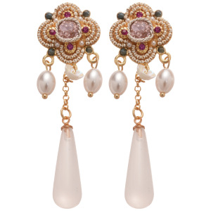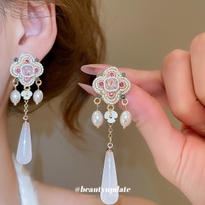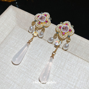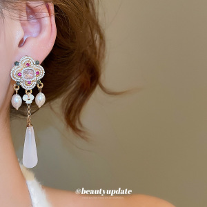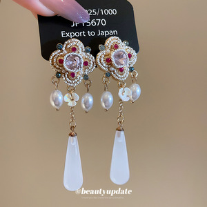 银针超闪镶钻珍珠花朵树脂水滴吊坠耳环宫廷风耳钉轻奢高级感耳饰