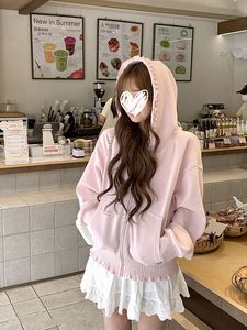 自家工厂粉色拉链连帽卫衣外套女慵懒宽松木耳边花边长袖上衣开衫