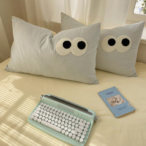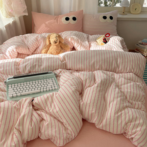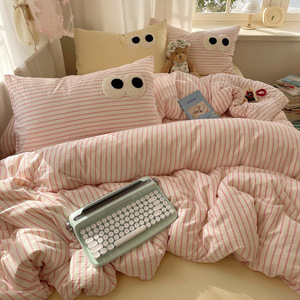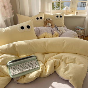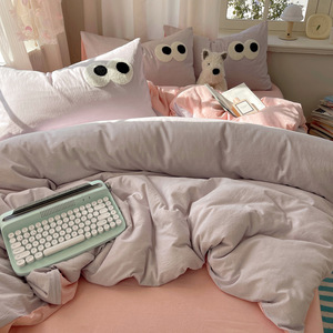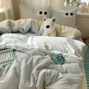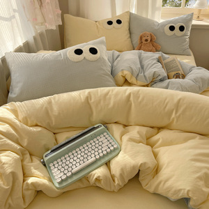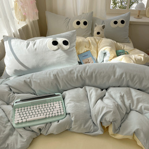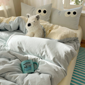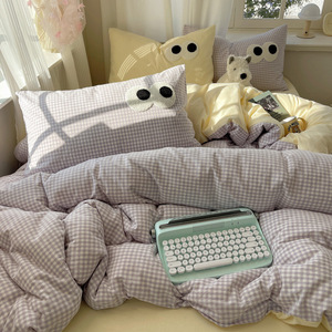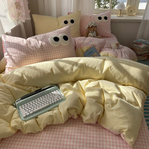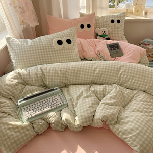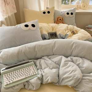 A类母婴级裸睡软糯云柔纯水洗棉大眼睛毛巾绣混搭格子撞色四件套