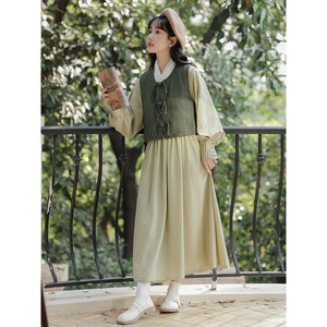 青黛明制春秋2025新款改良汉元素日常毛呢马甲+背心连衣裙套装女