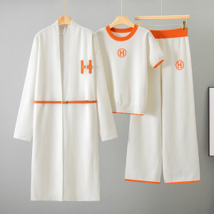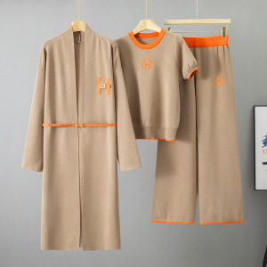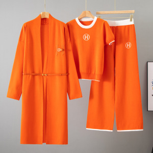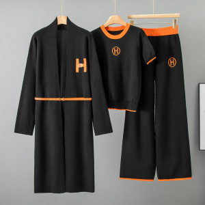 跨境新款秋冬慵懒风休闲时尚女装针织长款披肩开衫毛衣阔腿裤三件