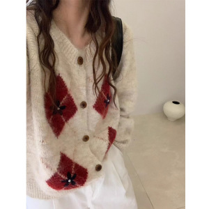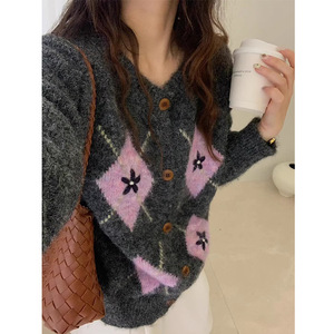 韩版复古刺绣花朵菱格毛衣外套女装2025年秋冬设计感针织开衫上衣
