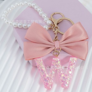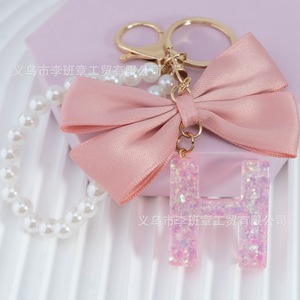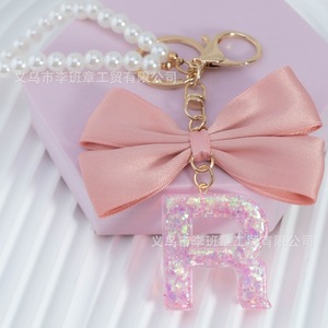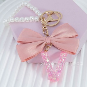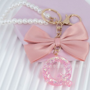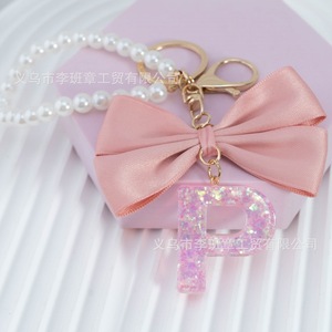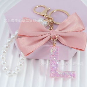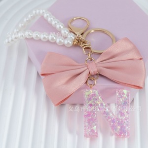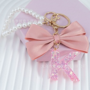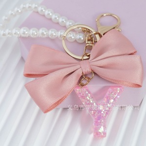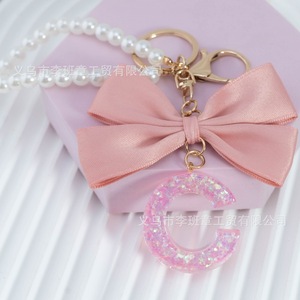 厂家供销粉蝴蝶结26英文字母钥匙扣仿珍珠串钥匙挂件女士包包挂件