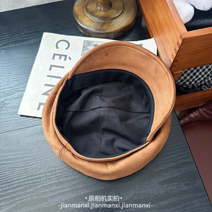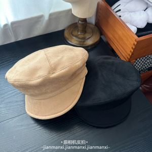 麂皮绒简约平顶软帽檐贝雷帽子女秋冬显脸小报童帽英伦风画家帽男