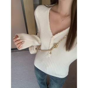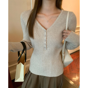别致修身V领纽扣收腰打底衫女早秋减龄内搭高级感毛衣针织衫上衣